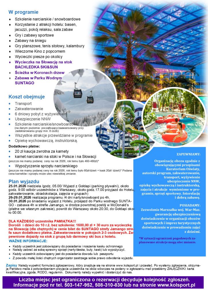 FORMULARZ ZGŁOSZENIOWY Imię i nazwisko rodzica (wymagane) Telefon kontaktowy rodzica (wymagane) Adres email rodzica (wymagane) Imię i nazwisko dziecka (wymagane) Adres zamieszkania (wymagane) Data urodzenia dziecka w formacie RRRR-MM-DD (wymagane) Pesel dziecka (wymagane) Wybór (wymagane) Narty początkującyNarty zaawansowaneSnowboard PoczątkującySnowboard zaawansowany Czy dziecko uczęszcza na zajęcia Szkoły Pływania AK? (wymagane) TakNie Czy dziecko było uczestnikiem obozów sportowych KOLSPORT? (wymagane) TakNie Uwagi Przepisz od końca wyraz "zima" Δ Podziel sięFacebookTwitterGoogle+