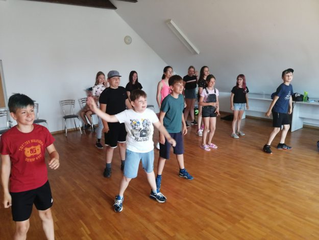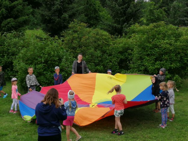 Rozpoczęliśmy nowy turnus półkolonii. Po zapoznaniu w grupach rozpoczęliśmy zajęcia. Były gry i zabawy, tańce, trochę zabawy na placu zabaw…